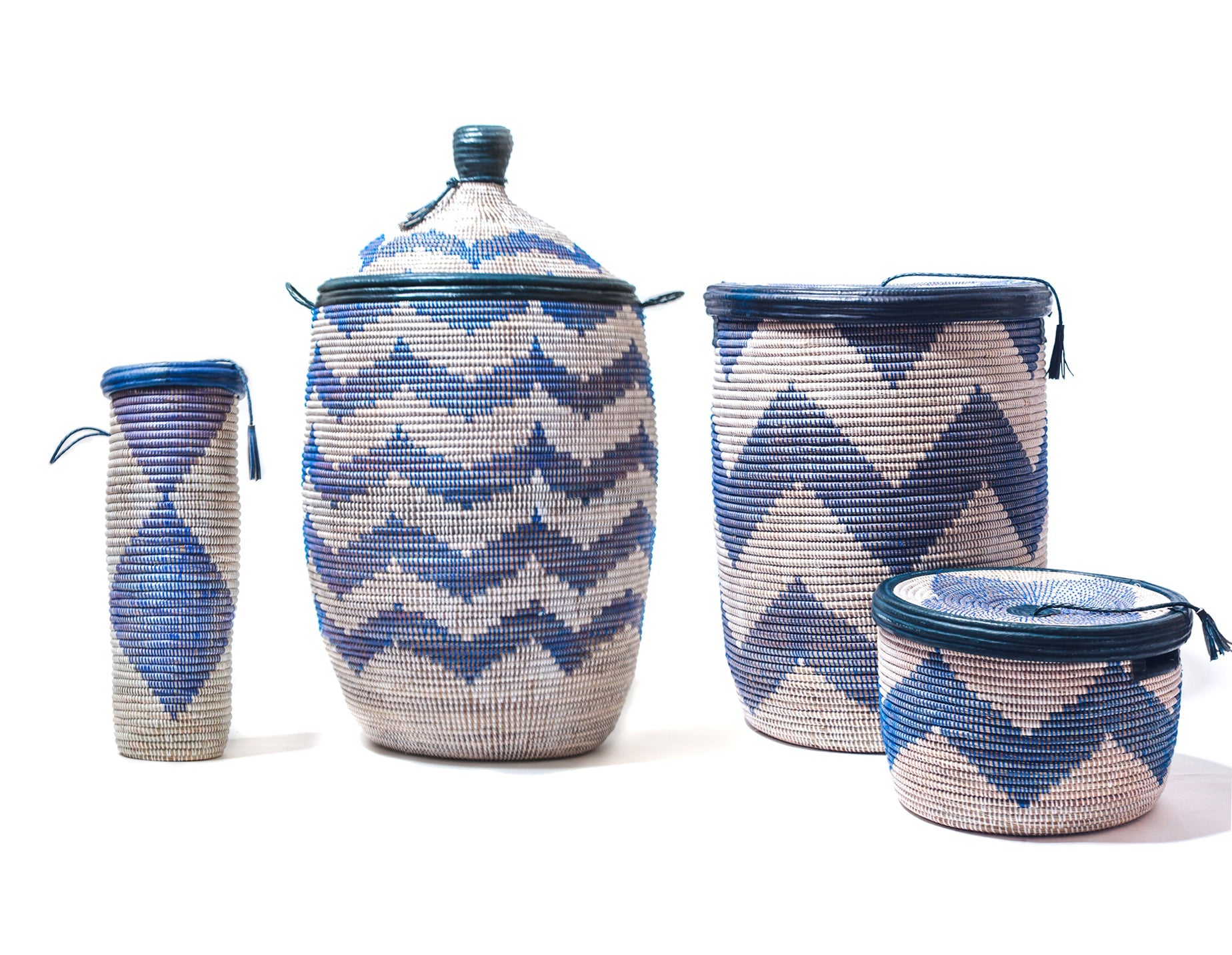The Winter Blues collection stands out with its natural blue and white pattern. Handcrafted from salvaged plastic and dark blue organic leather, the baskets boast organic leather trim and have luxe details ranging from textured handles to braided tassels.