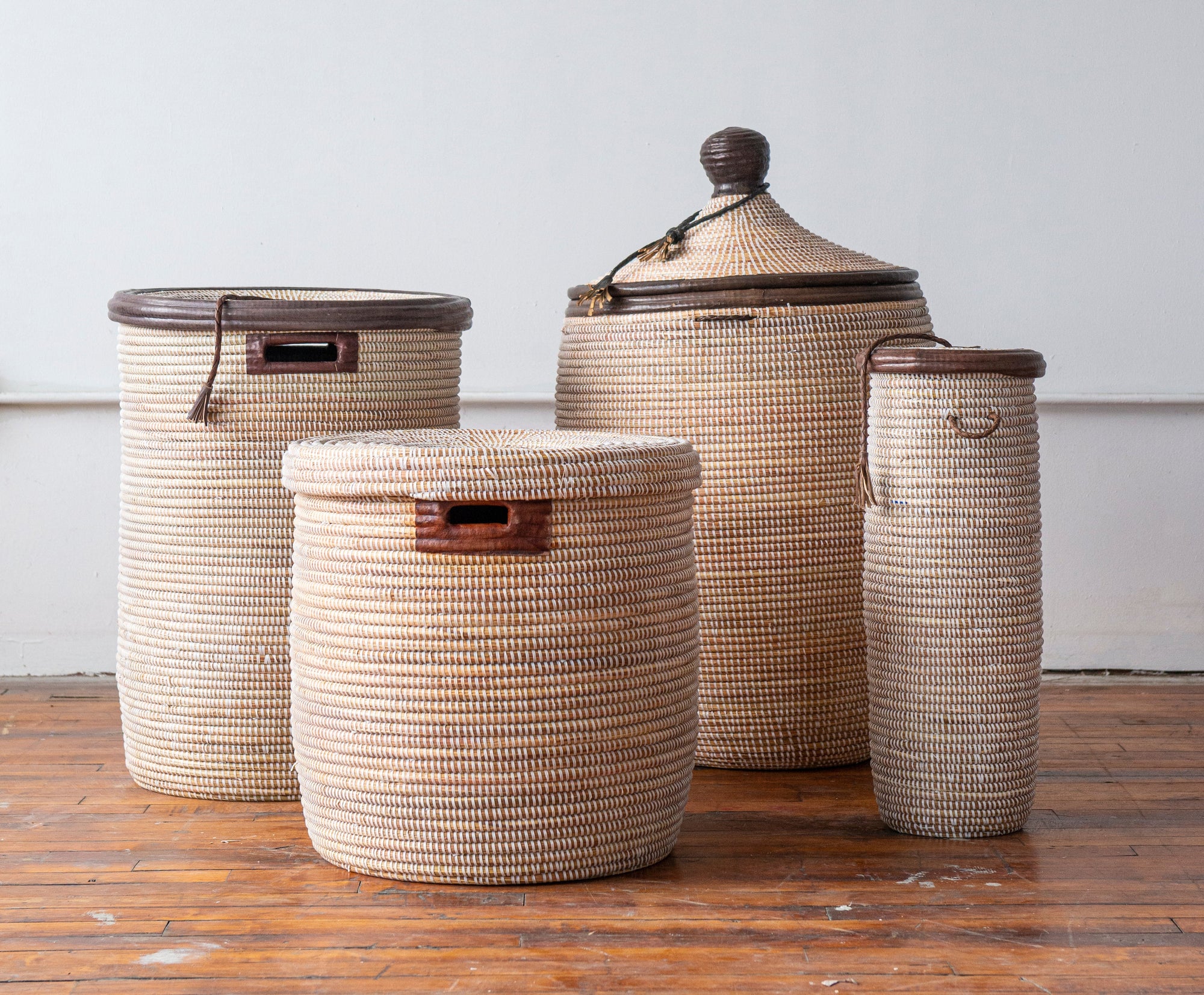The Njabot collection stands out with its natural muted white and dark brown leather detail. Handcrafted from salvaged plastic and dark brown organic leather, the baskets boast organic leather trim and have luxe details ranging from textured handles to braided tassels.